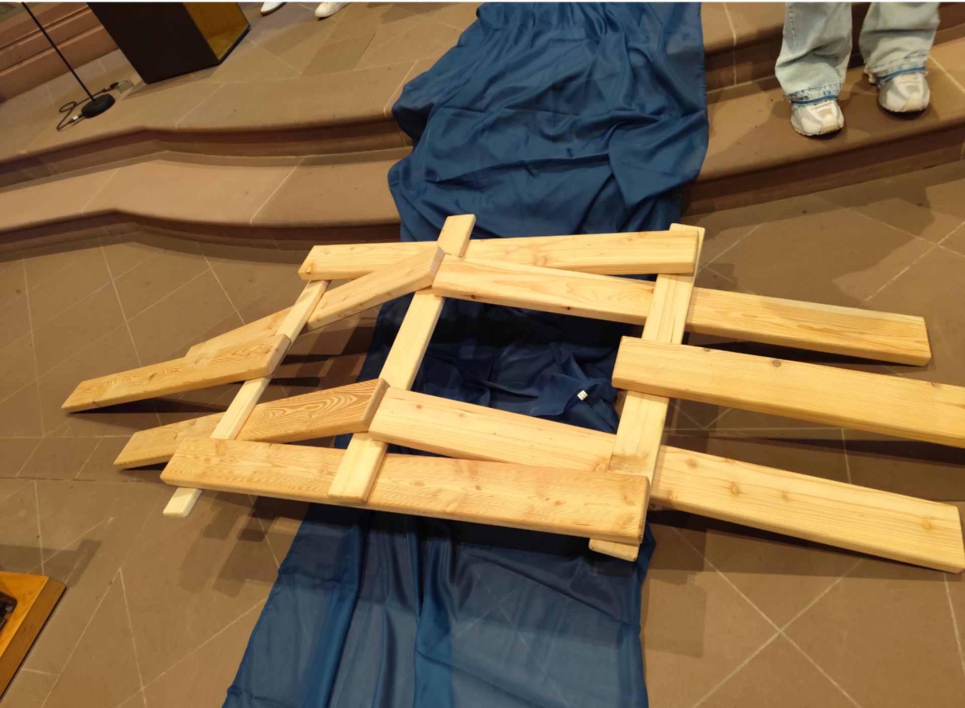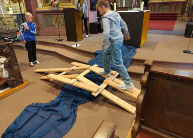 Am Donnerstag, den 18.09.2025 fanden die Gottesdienste zum Schuljahresanfang in der Kirche St. Michael in Lohr statt. Das Gottesdienstteam um Frau Pfarrerin Schürmann und die beiden Religionslehrerinnen Frau Seher und Frau Spall hatten mit einer Brücke ganz aus Brettern – ohne Nägel oder Schrauben – das Interesse der Schulfamilie schnell geweckt. In der Ansprache machte Frau Schürmann deutlich, dass wir in unserem Schulalltag immer wieder Brücken bauen werden und wir Menschen brauchen, die uns über diese Brücken begleiten. In beiden Durchgängen gelang es dem Wanderer, wohlbehalten auf der anderen Seite des Flusses anzukommen.